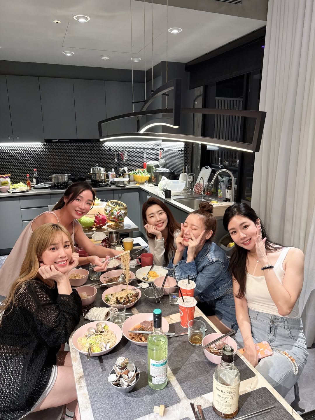 設備齊全的工業風開放式廚房,讓聚餐變成一種享受。長桌上擺滿了海鮮麵、美酒與笑聲。暖黃色的設計感吊燈下,大家圍坐在一起,分享的不只是美食,更是那份難得的相聚心情。