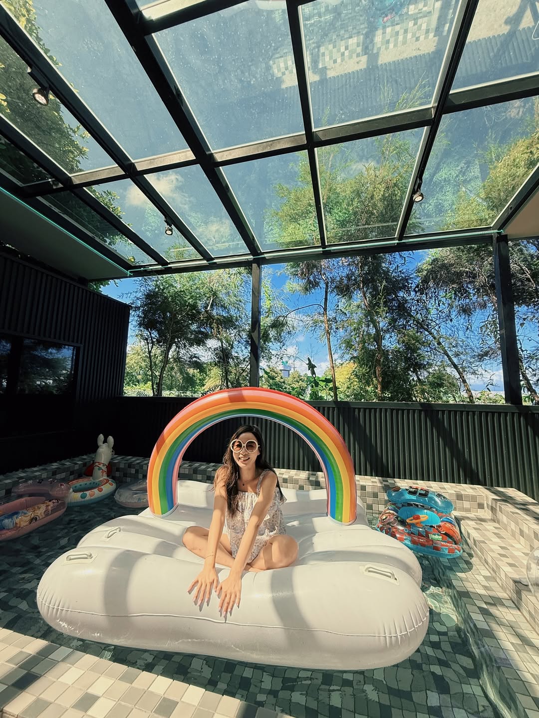 即使不出門,民宿內的半露天戲水池也能讓你玩上一整天。採光極佳的透明頂棚,擋住了雨水卻留住了陽光。坐在巨大的彩虹雲朵浮球上,伴著宜蘭的藍天綠樹,這就是夢想中的度假生活。