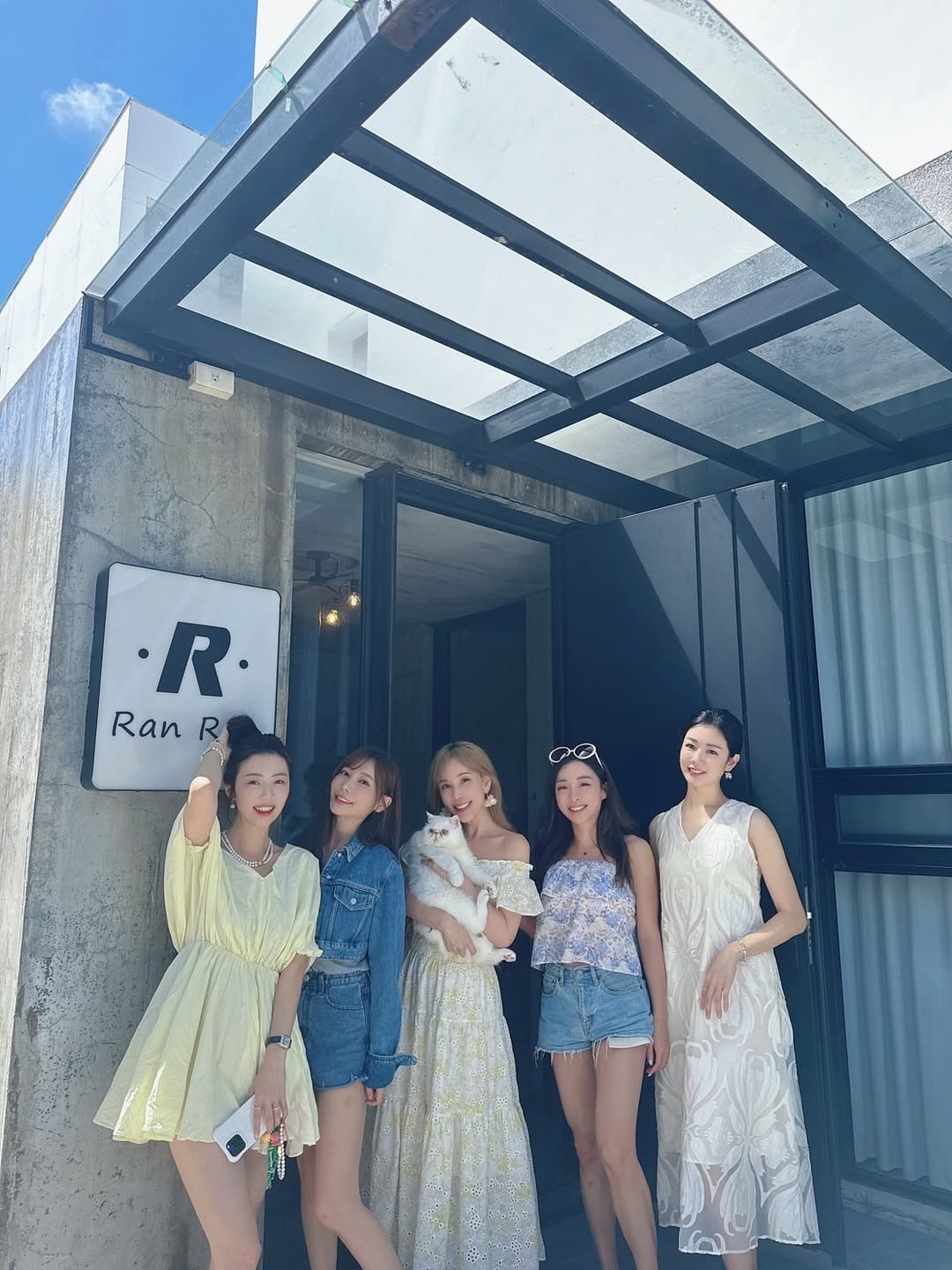 簡約的大型「R」字招牌與清水模牆面,構築了民宿帥氣的門面。姐妹們排排站,連可愛的貓咪也一起入鏡,這張大合照宣告著一場完美旅程的開始。