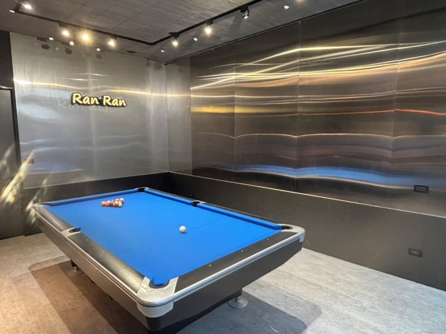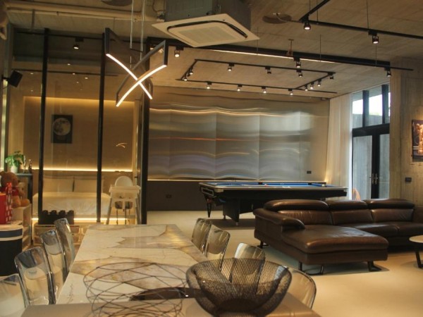 有設計感又超好拍的大廳空間,清水模搭配藝術燈飾、質感沙發、按摩椅和撞球桌、電動麻將桌等。