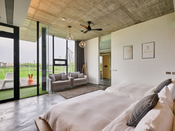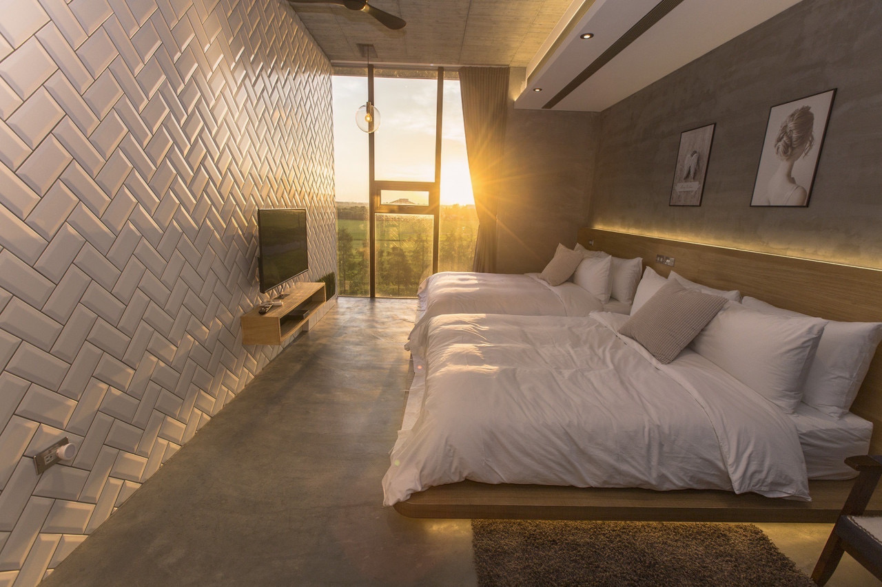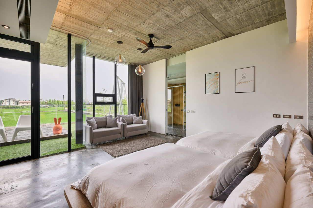 以開闊格局與大量自然採光為特色,配置兩張舒適大床,空間寬敞不擁擠。大片落地窗引入戶外綠景,讓整個房間充滿明亮與放鬆的氛圍。